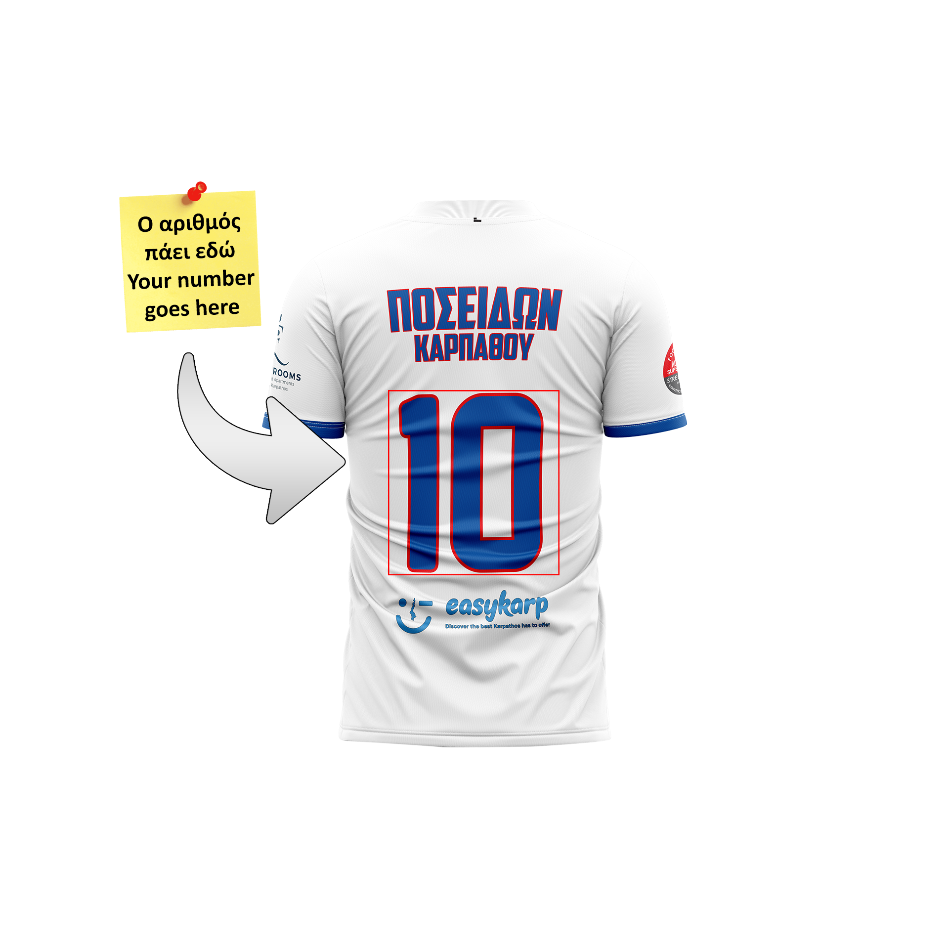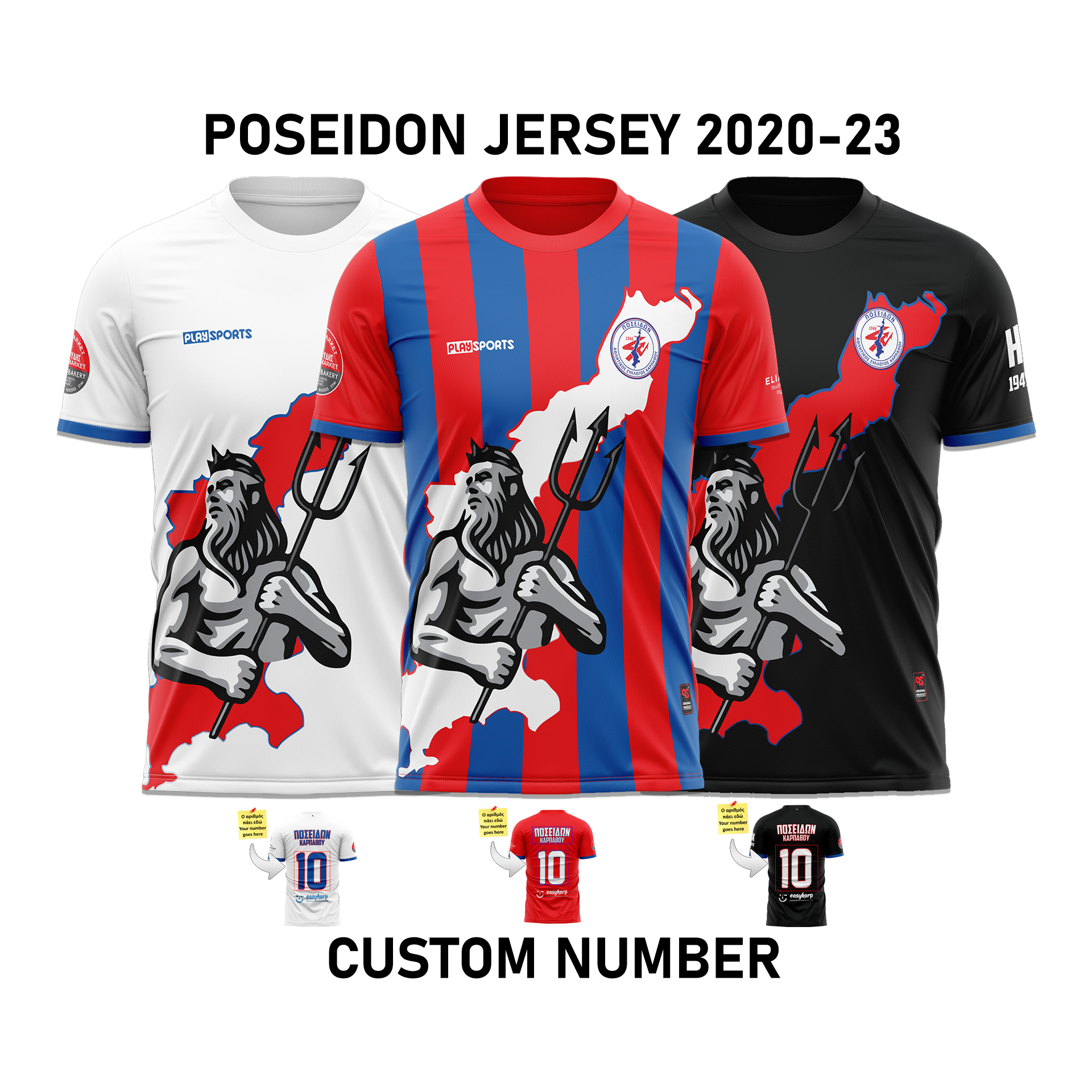 Με αυτό το προϊόν σας δίνεται η δυνατότητα απόκτησης της εμφάνισης Poseidon 2020-23, στο χρώμα της επιλογής σας (κόκκινη/μπλε, λευκή, μαύρη) και με τον αριθμό της επιλογής σας τυπωμένο στο πίσω μέρος της εμφάνισης, πάνω από το σήμα του χορηγού της εμφάνισης.