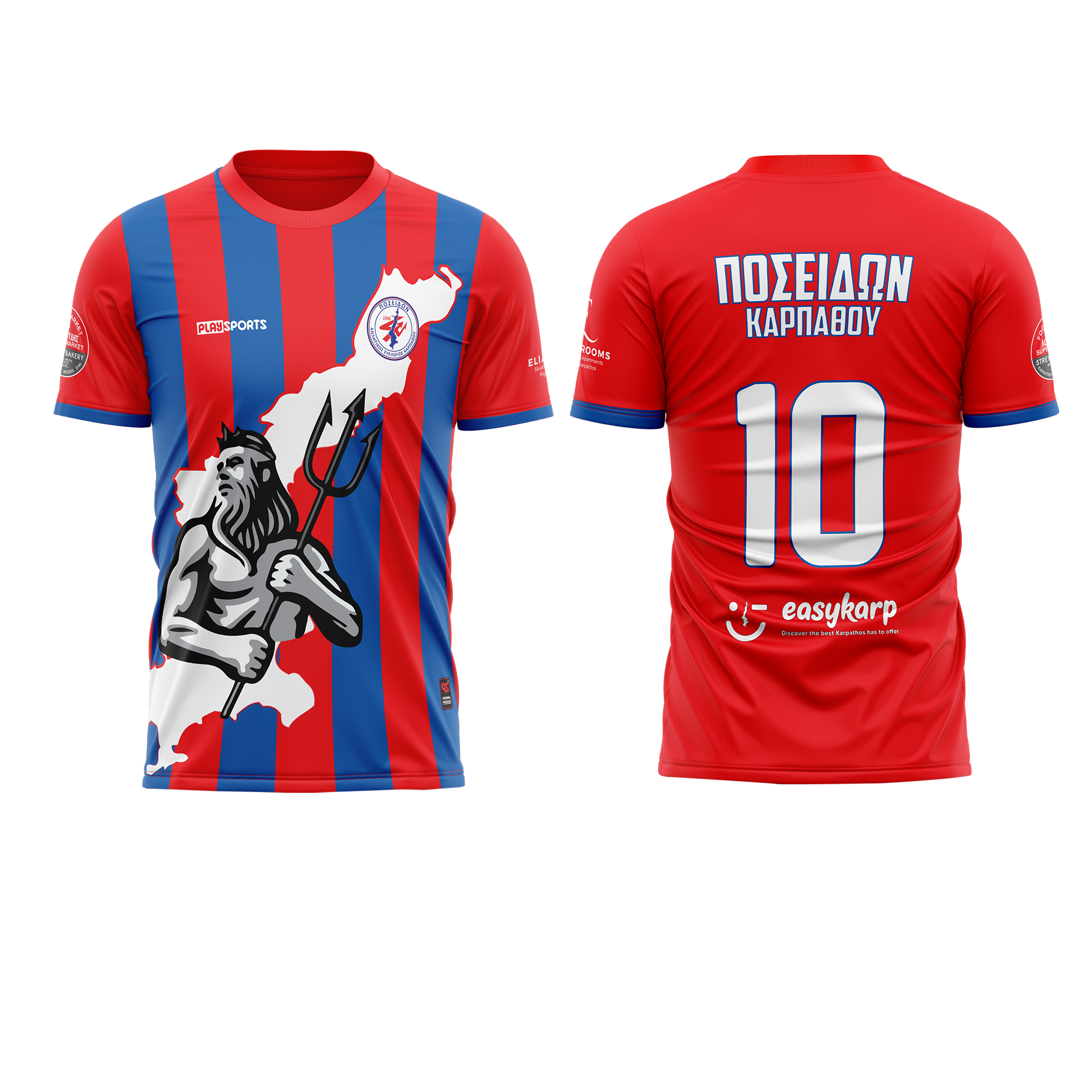 Η ριγωτή εμφάνιση διαθέτει ένα λευκό περίγραμμα της Καρπάθου που εκτείνεται διαγώνια από τον αριστερό ώμο προς τα κάτω δεξιά, όπου η θεότητα του Ποσειδώνα κατοικεί πάνω από το περίγραμμα του νησιού και κάτω από αυτό μια θάλασσα από μπλε και κόκκινες ρίγες, τα χρώματα του συλλόγου μας.